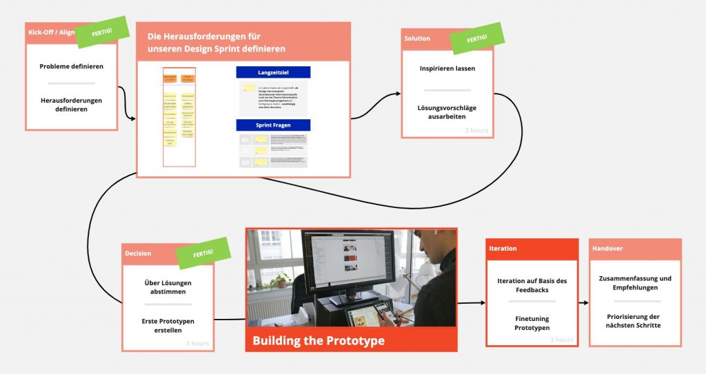Als Lösung wurde ein strukturierter, mehrwöchiger Remote Design Sprint gewählt, der von mir konzipiert, moderiert und nachbereitet wurde. Dieser Ansatz ermöglichte es mir, interdisziplinäre Teams zusammenzubringen, um schnell von der Problemdefinition zu einer validierten Lösung zu gelangen.