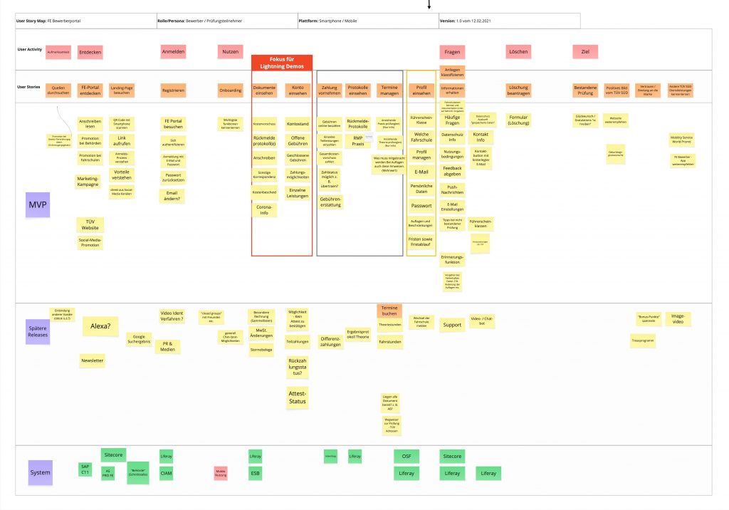 Vorbereitung und Kick-Off: In der ersten Woche wurden die Projektziele geschärft, das ambitionierte Langzeitziel definiert und die zentralen Herausforderungen in konkrete Sprint-Fragen überführt. Die Basis für die gesamte weitere Arbeit wurde mit einer detaillierten User Story Map gelegt, die alle Nutzeraktivitäten von „Anmelden“ über „Nutzen“ bis „Entdecken“ abbildete.